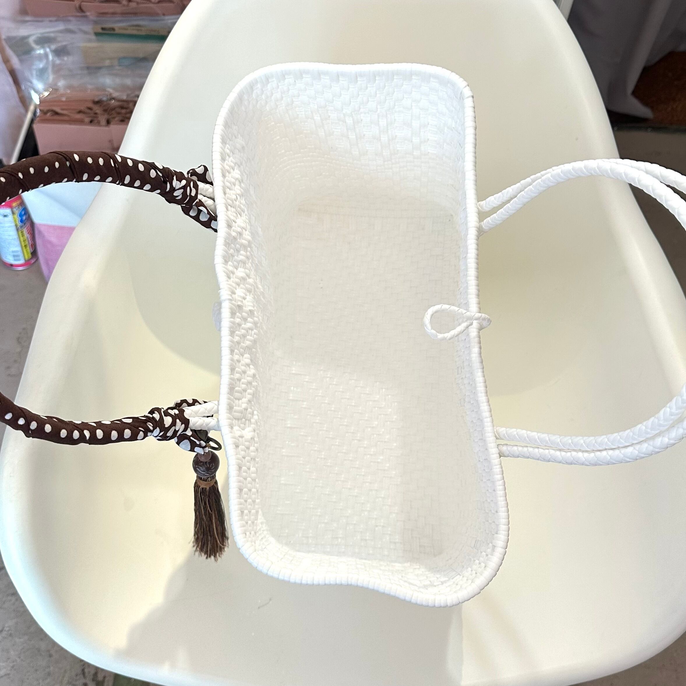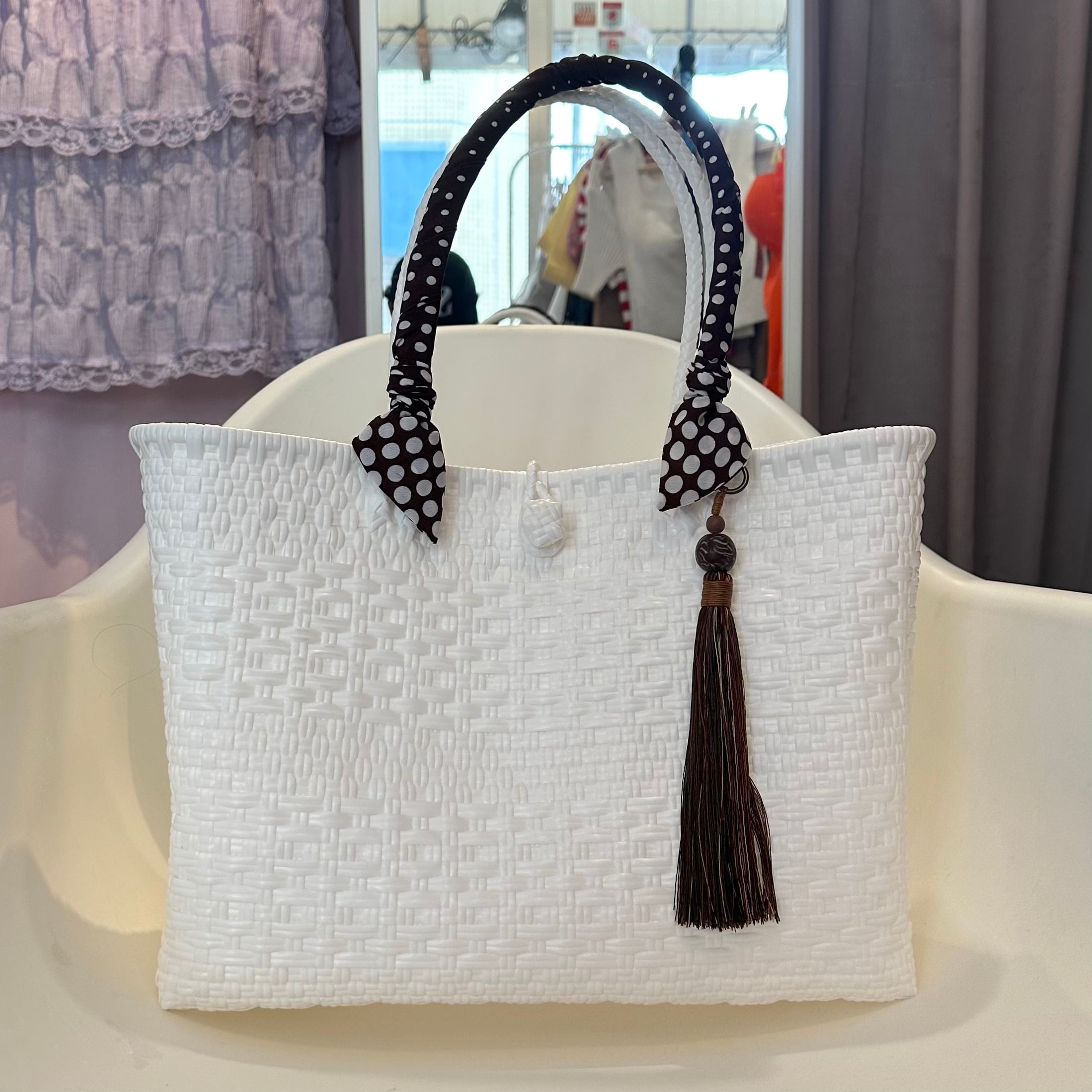 洗練されたイメージのホワイトに、茶色のリボンチャームが効いています!