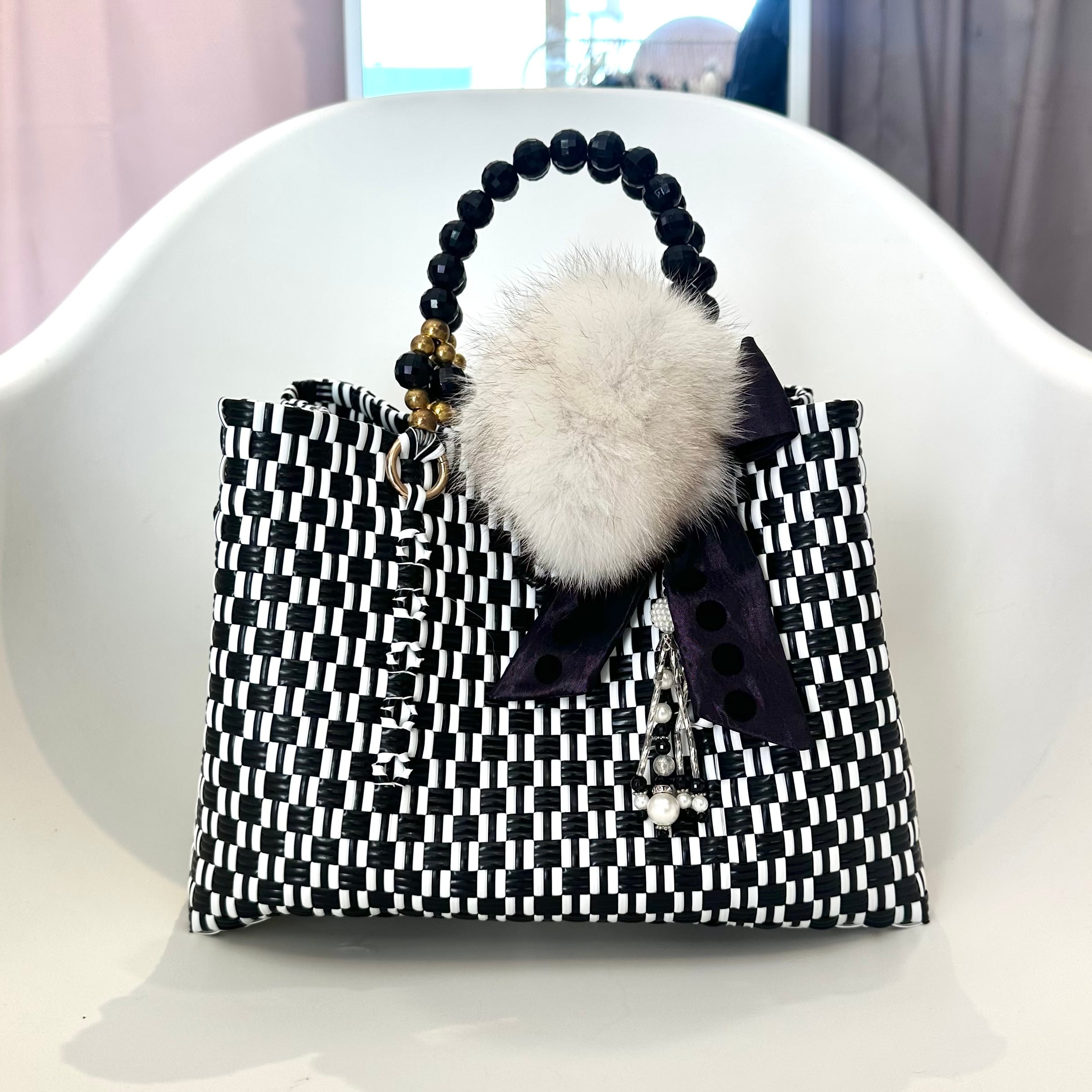 バリニーズバッグ.エレガンスシリーズ.MSサイズ.ポイントファー.ホワイト×ブラック
