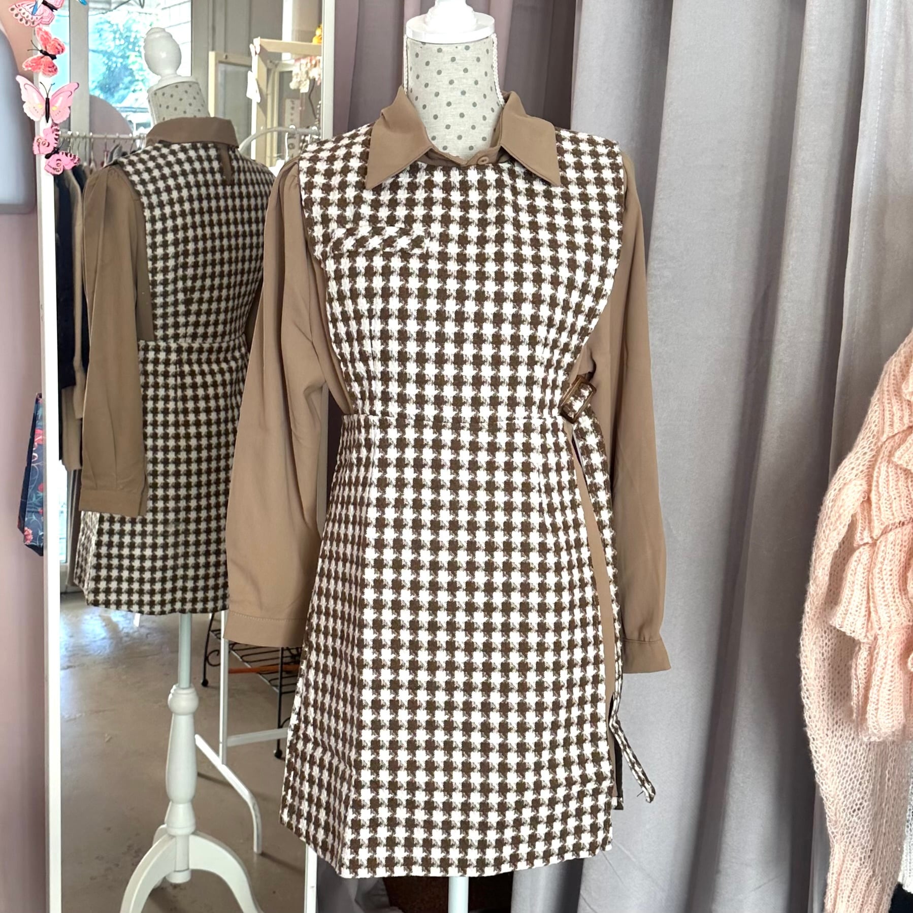 千鳥柄サイドベルト付きミニワンピ