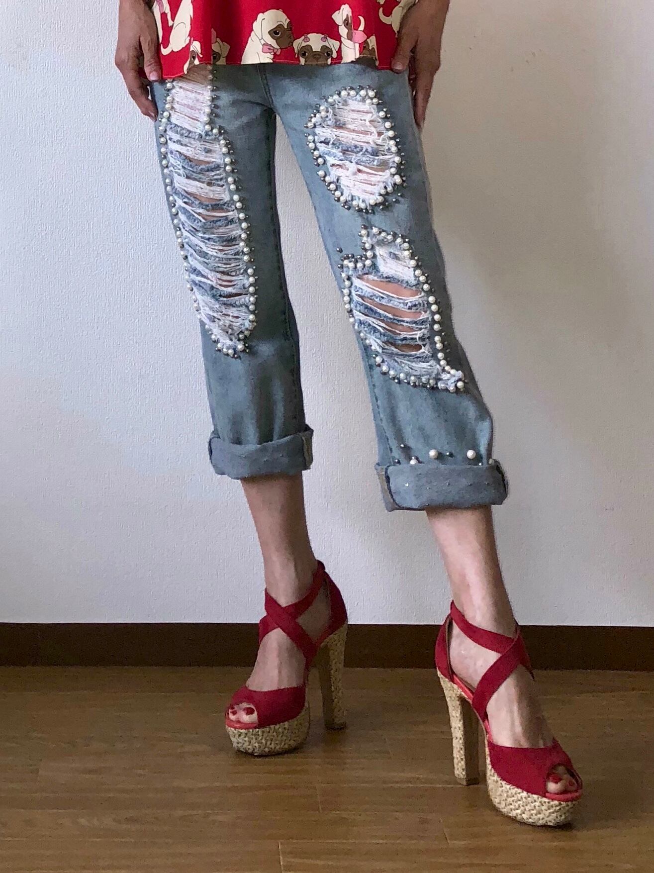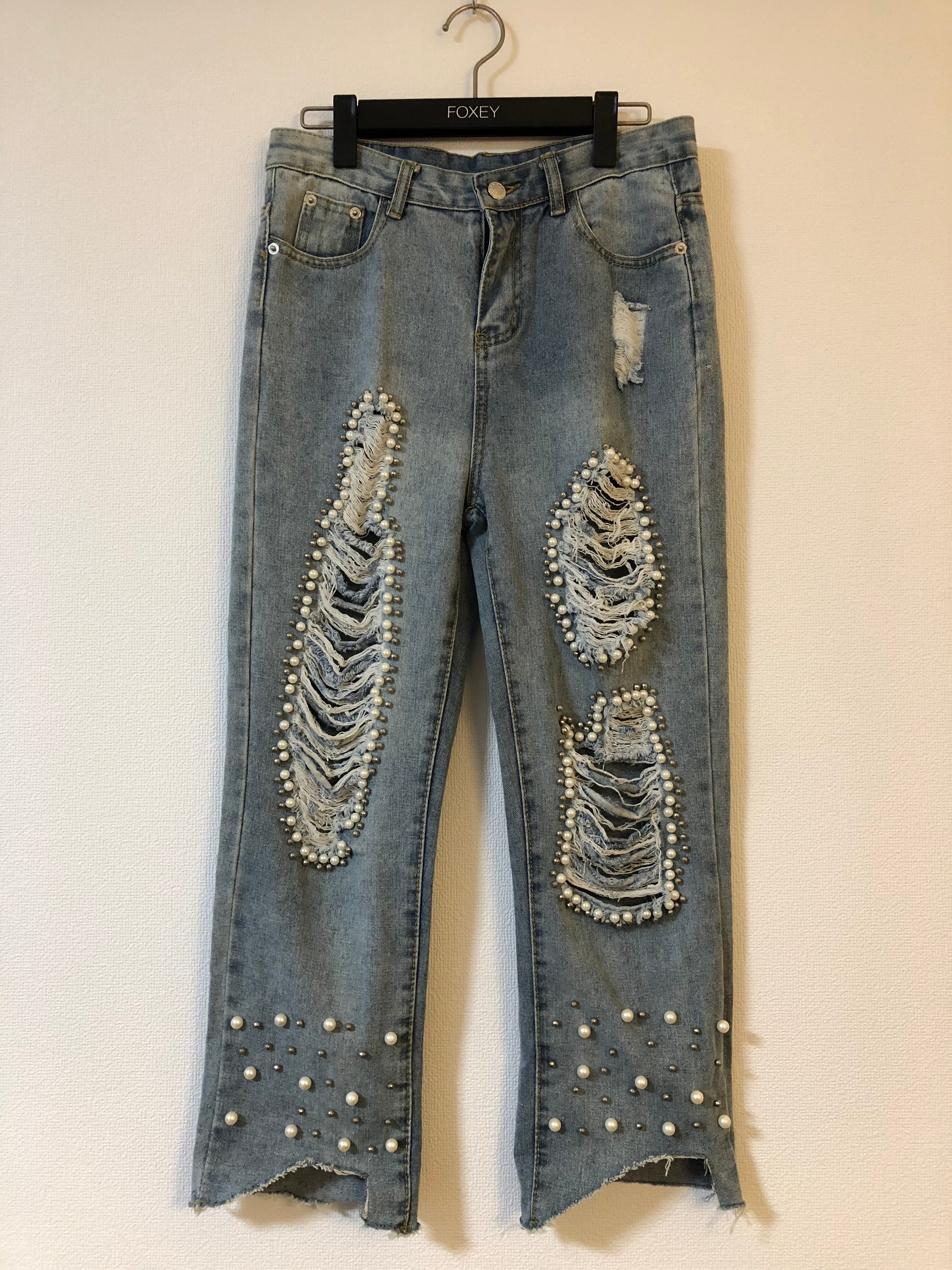 ダメージデニムはいっぱい売られていますが、こんなにパールとスタッズがついてるものはまず見かけませんね!