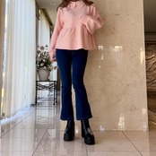 柔らかな杢ニット素材を使用したこのポロニットは、ストレッチ性があり、動きやすさが魅力のアイテムです!ぺプラムデザインが女性らしいラインを強調し、スタイリッシュに決まります^_−☆