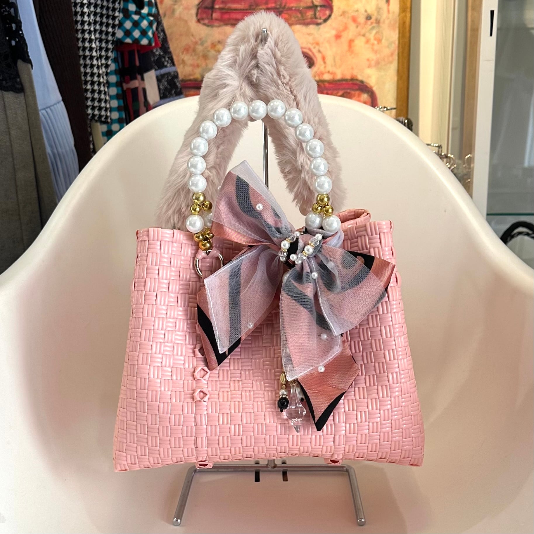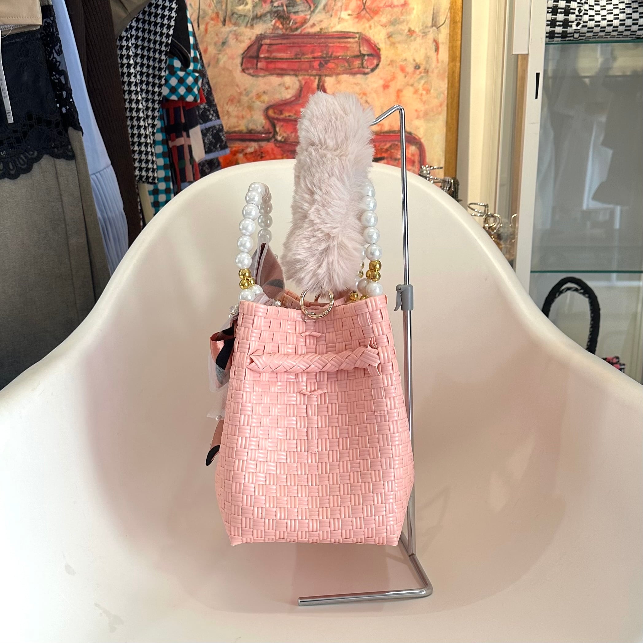 バリニーズバッグ.エレガンスシリーズMSサイズ.ベビーピンク.ファーハンドル付き