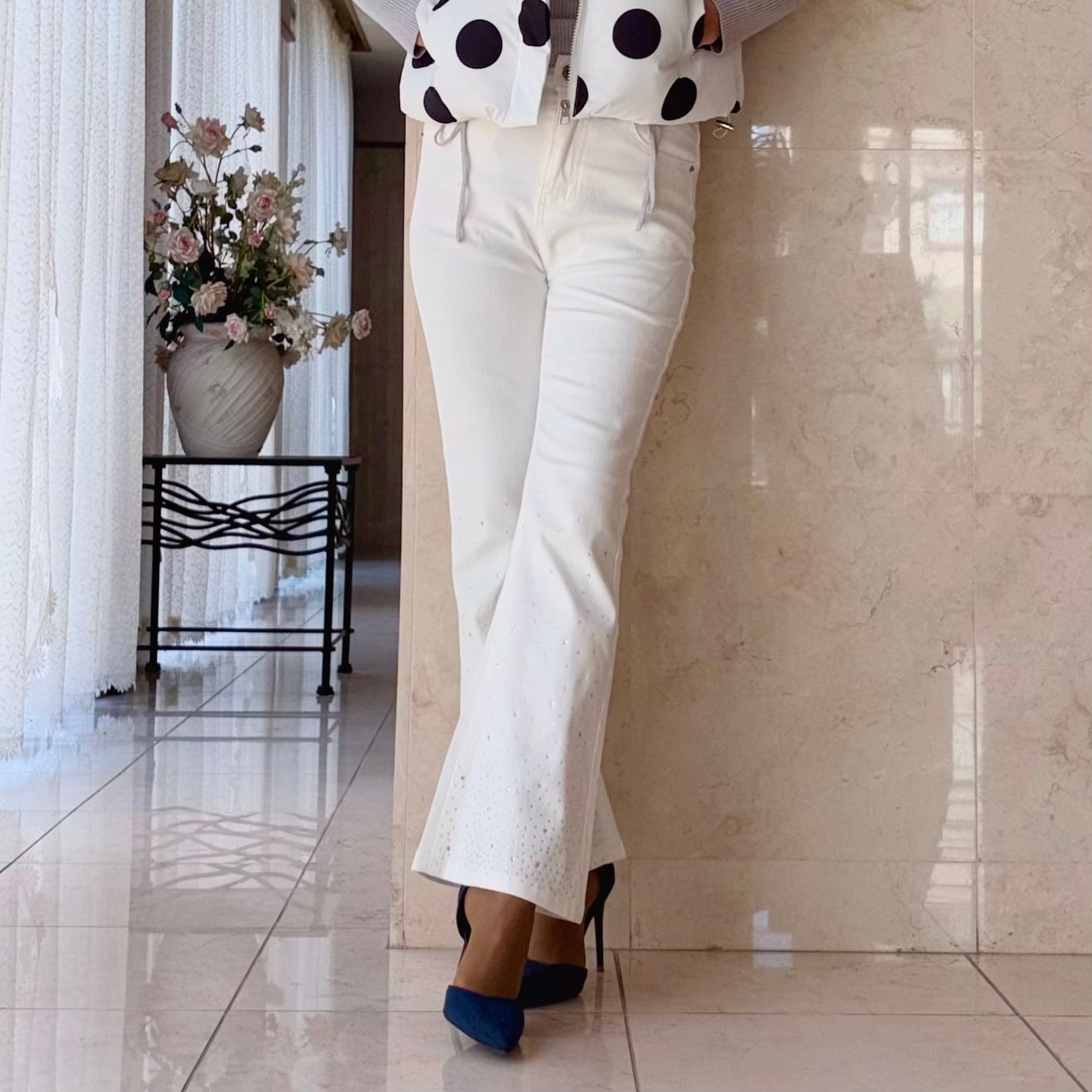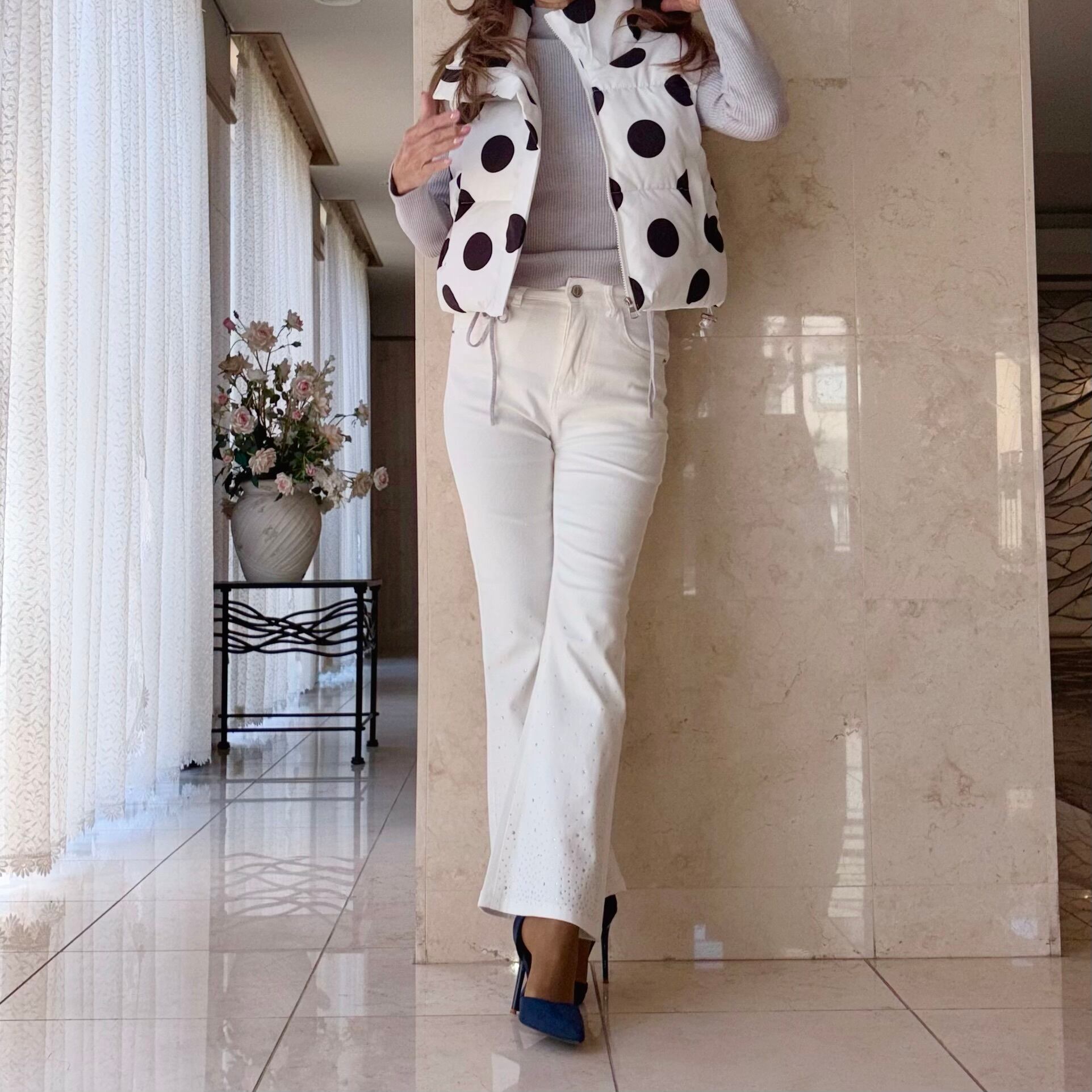 ひざから裾にかけてあしらったダイヤジルコンが、動くたびにキラリと光る女性仕様のホワイトデニムです♡