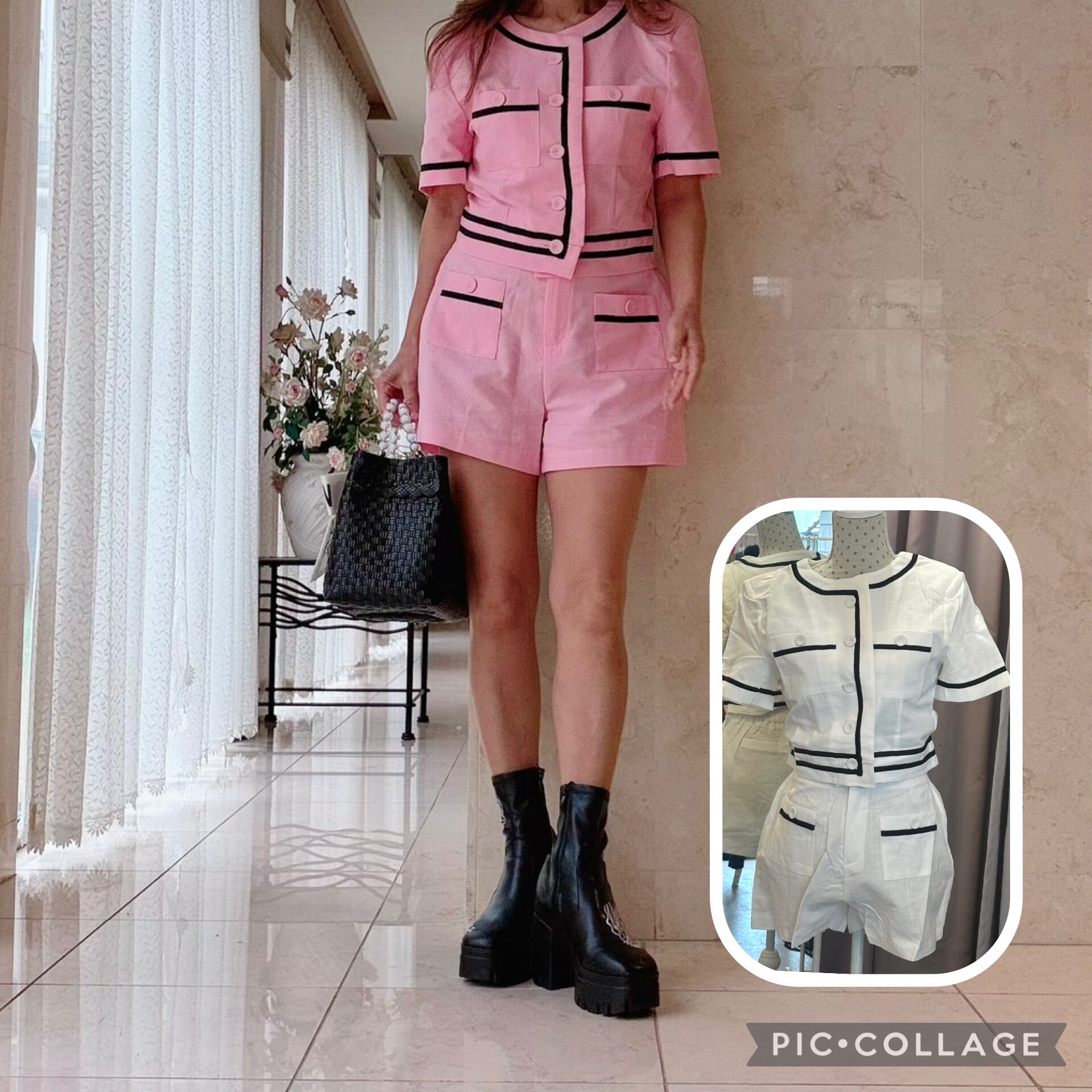 ジャケットは、コンパクトなシルエットで大人の女性にぴったり。ショーパンと合わせることで、スマートカジュアルな印象を与えつつ、トレンド感も楽しめる一着です。ぜひお手持ちのシューズとアクセサリーで、おしゃれなコーディネートを楽しんでくださいね!