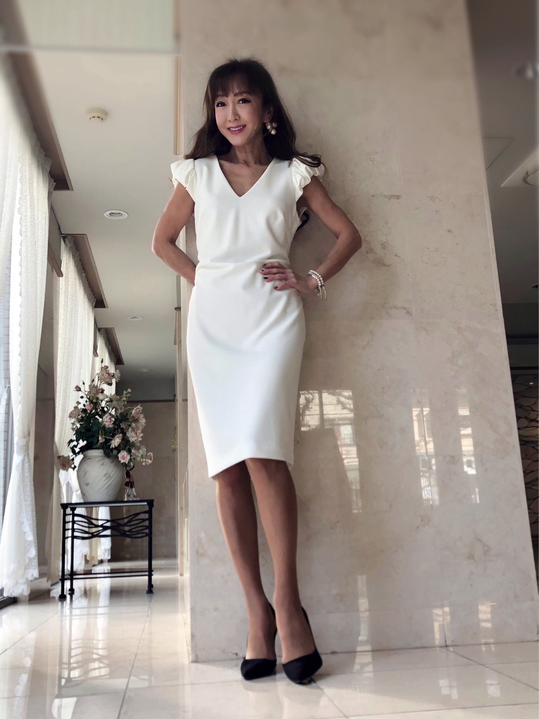 お袖、Vネックの開き加減、身ごろのシルエットなど、細部に渡り、シンプルだけど女性らしいドレスワンピースです。