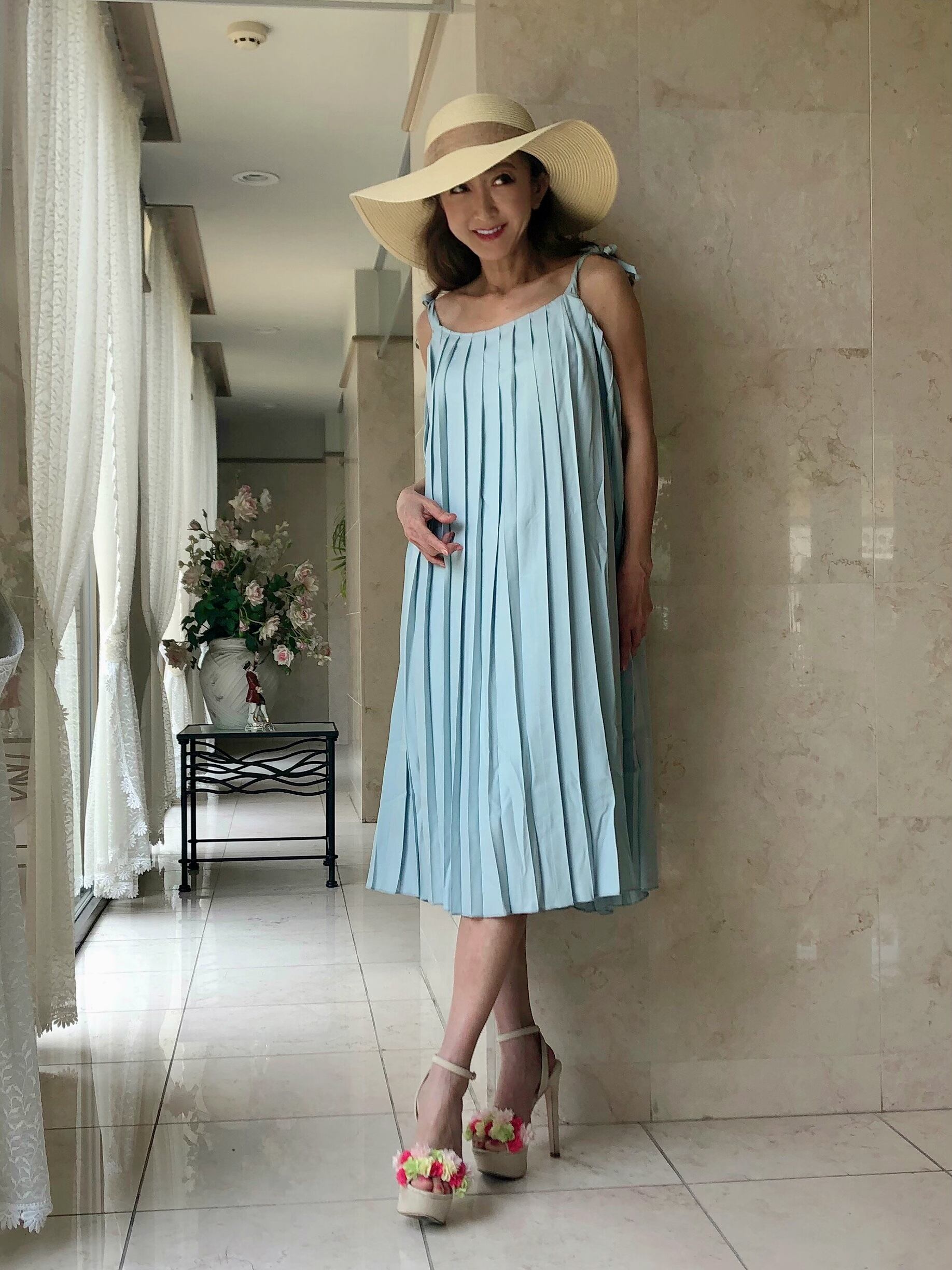 サイズ大きめ 上品プリーツワンピ ペールブルー