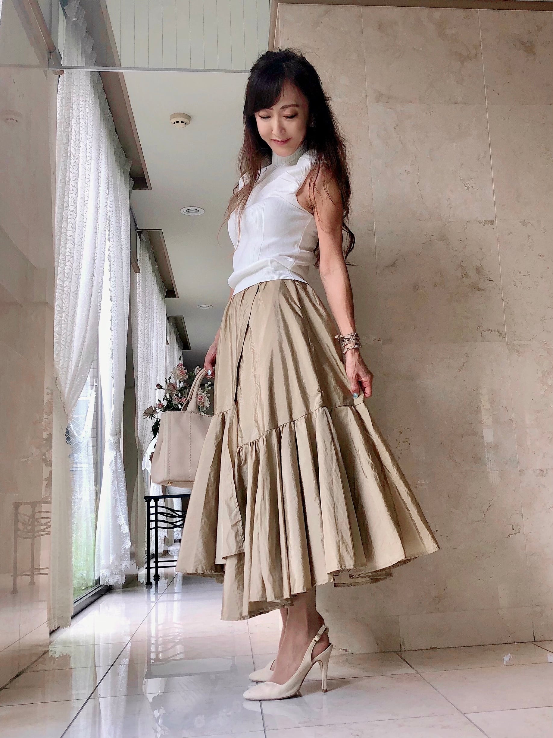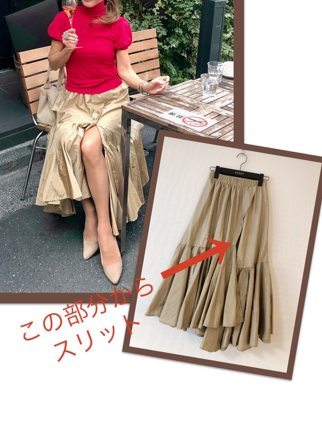 アシンメトリーな裾に、切り替え下のたっぷりのフレアー。