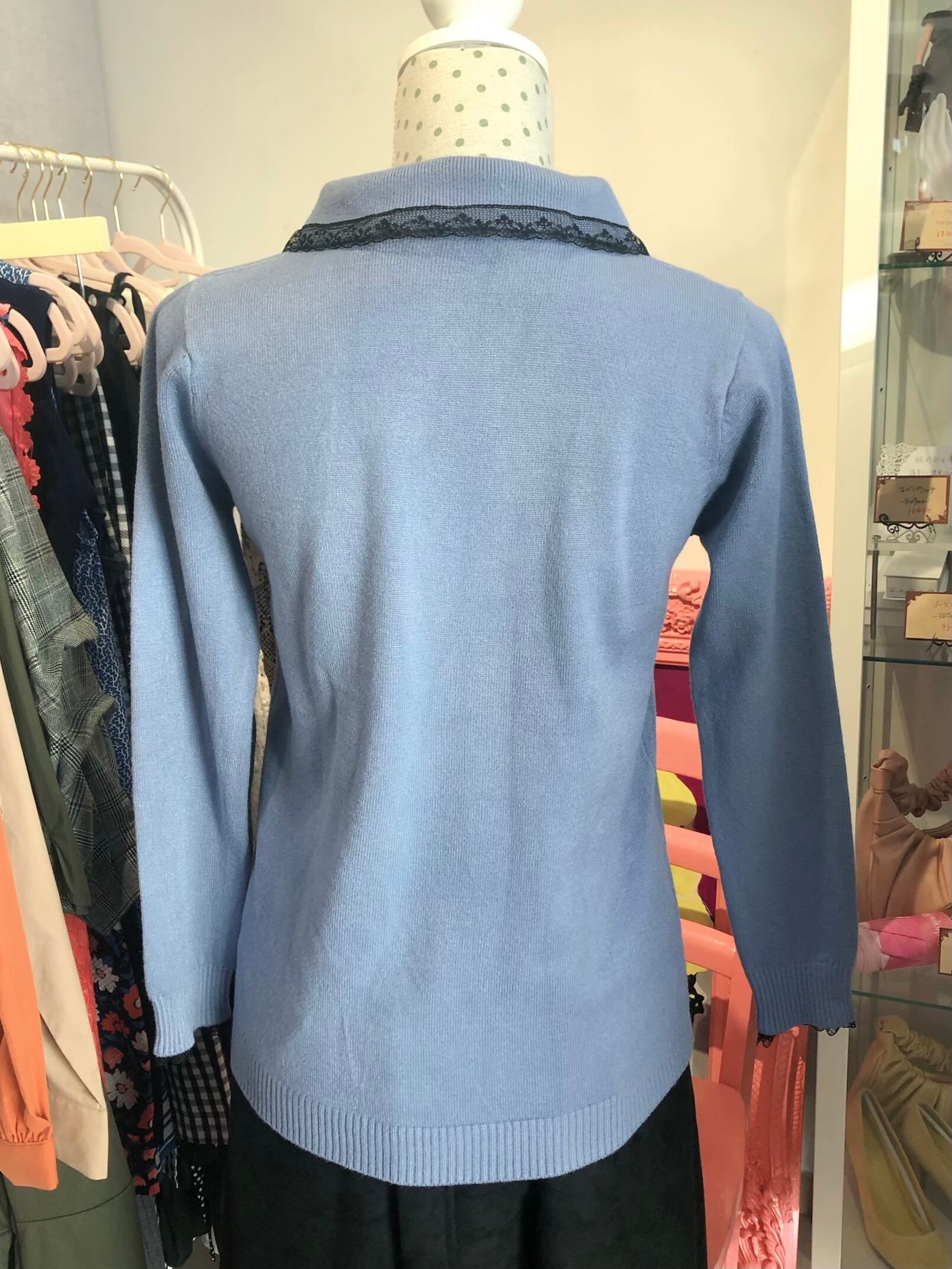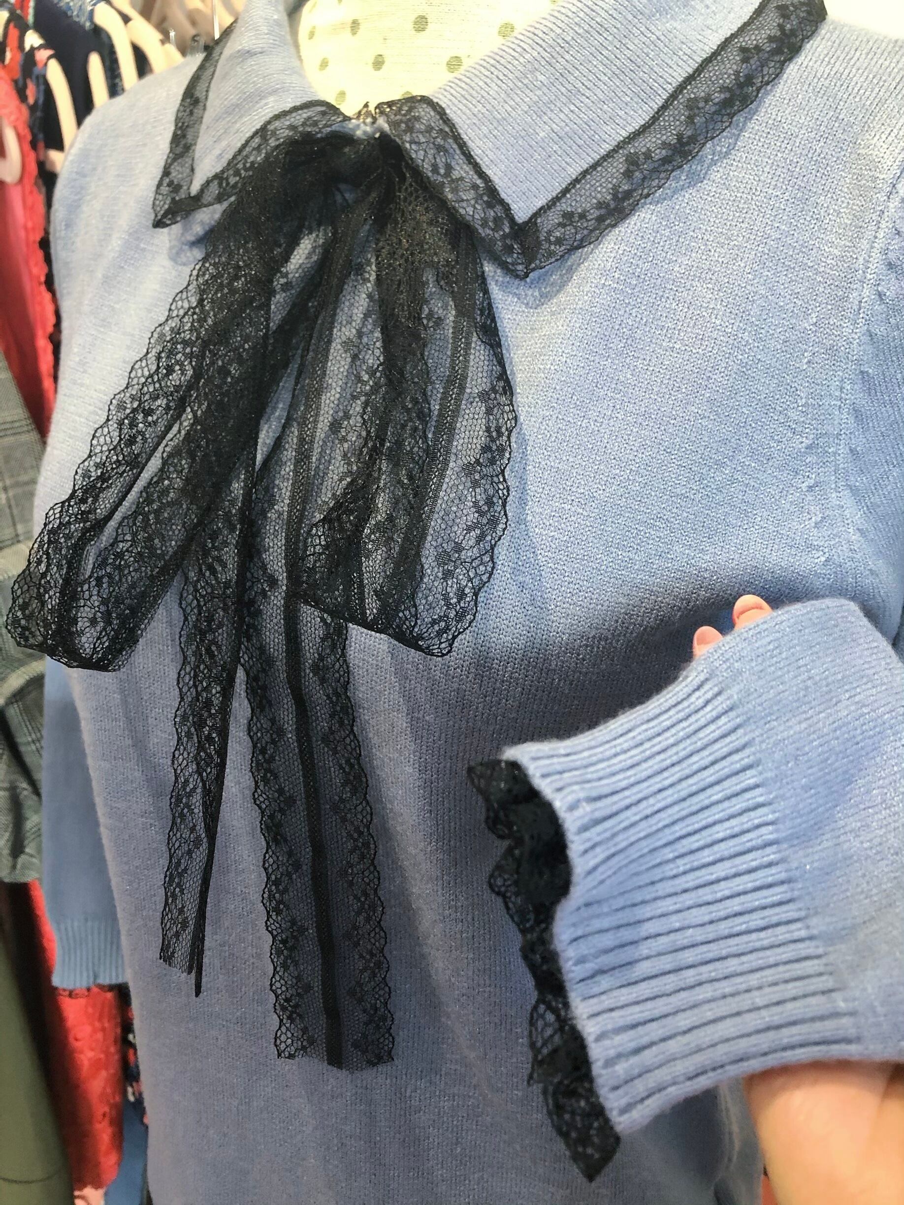 襟と袖口の黒レースがポイントの、春まで着られるニットです。