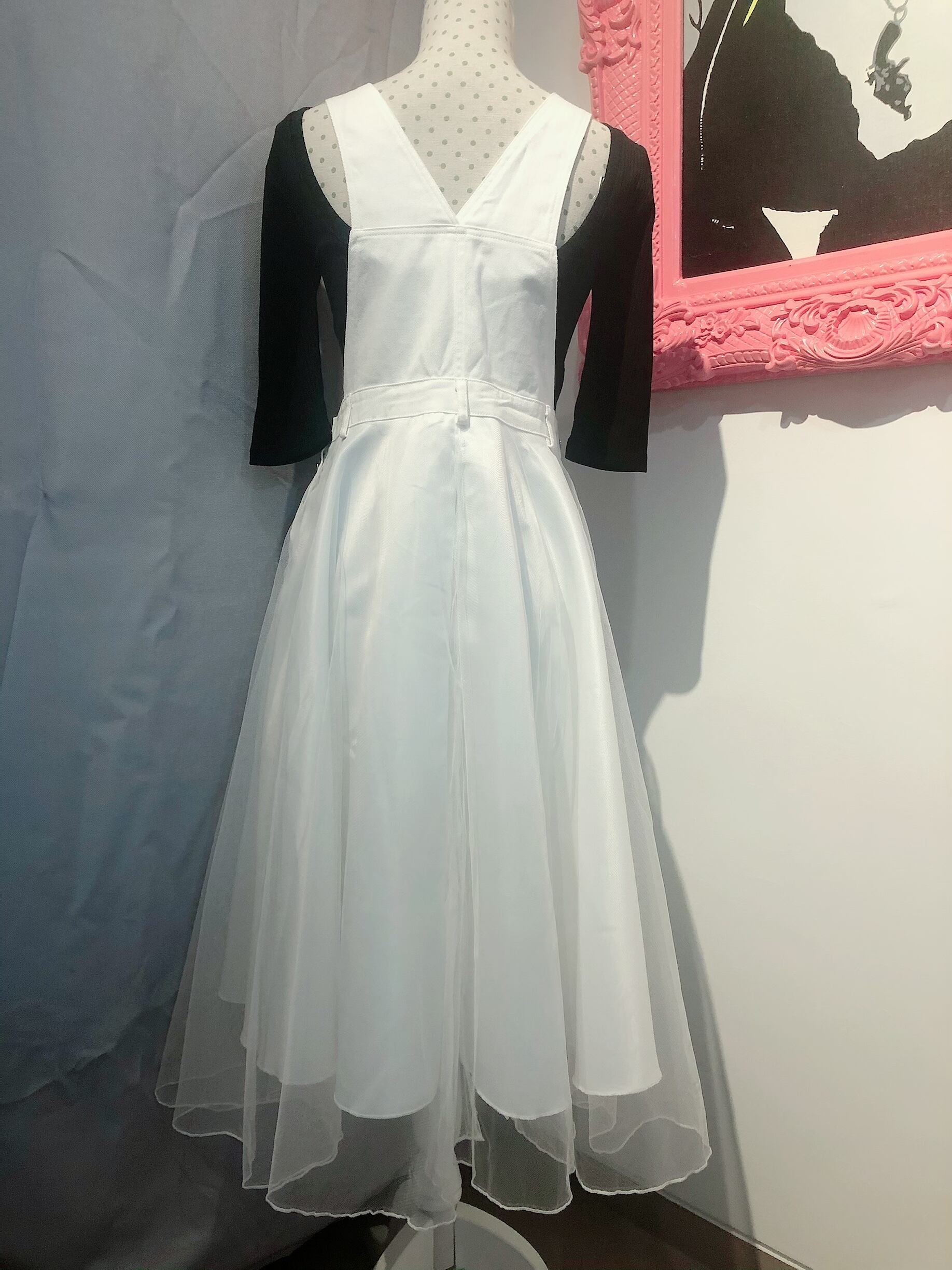 以前にもこのタイプのデニムジャンパースカートをご紹介したことがありますが、こちらはスカート部分にチュールを重ねた、よりフェミニンなタイプです♡