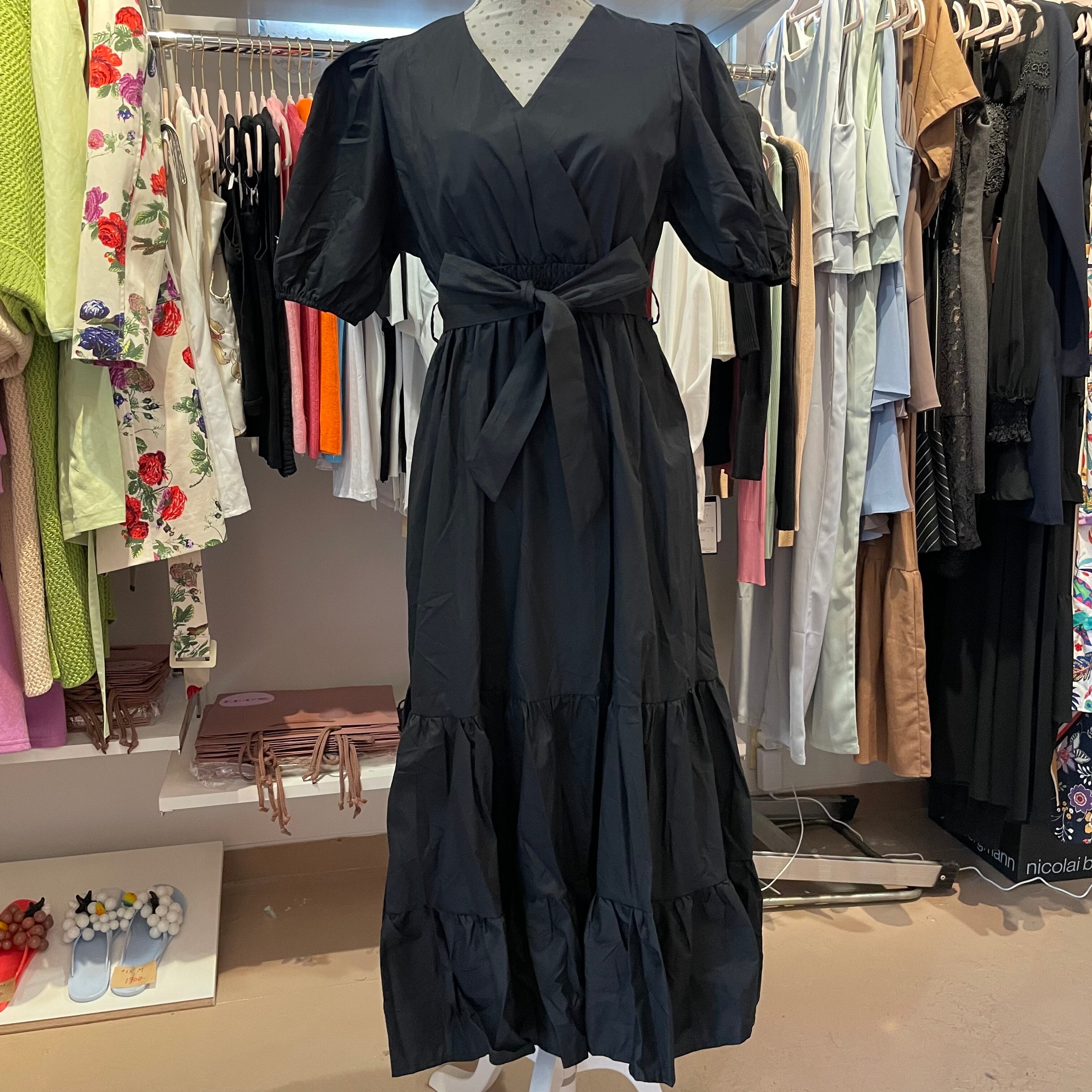 カシュクールふうの合わせに、ウエストの共リボン、パフスリーブ、スカート部分はティアード。