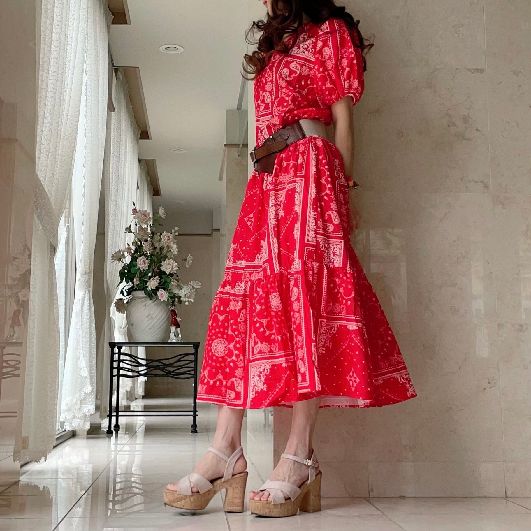 オレンジがかった赤が気分を上げてくれるマキシ丈ドレス♡