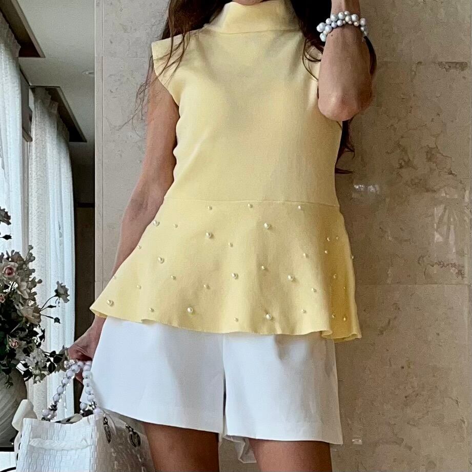 ペプラム部分にパールをあしらったフェミニンなトップスです♡