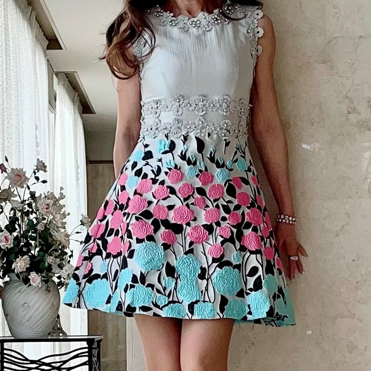 フラワーレース部分にジルコニアとカラーパールを配した、ゴージャス&キュートなミニドレスです♡