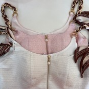胸元ファスナー、裾ファスナー、共にパールのワンポイントつき。