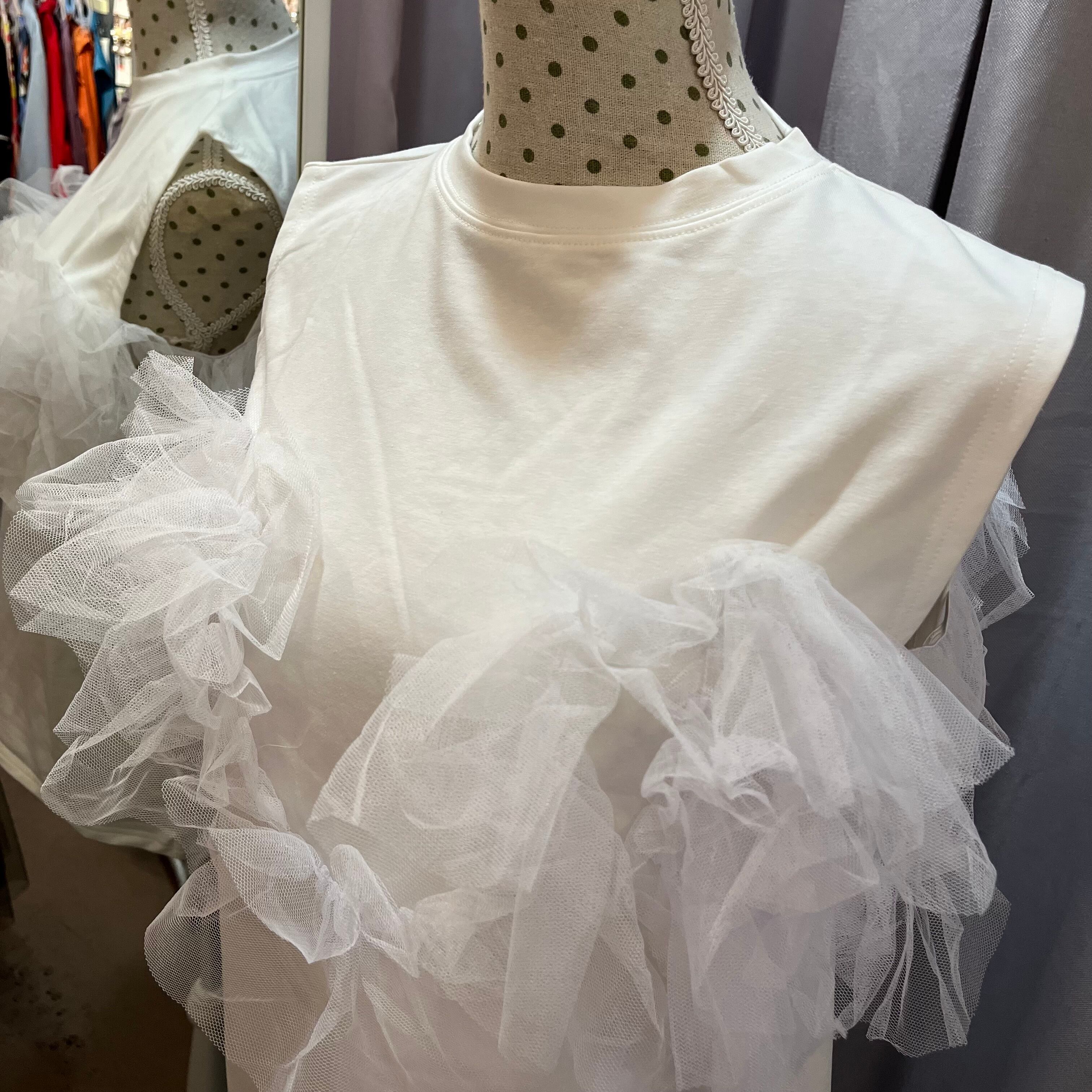 こちらは天竺素材にチュールをドッキングした技ありトップスです♡