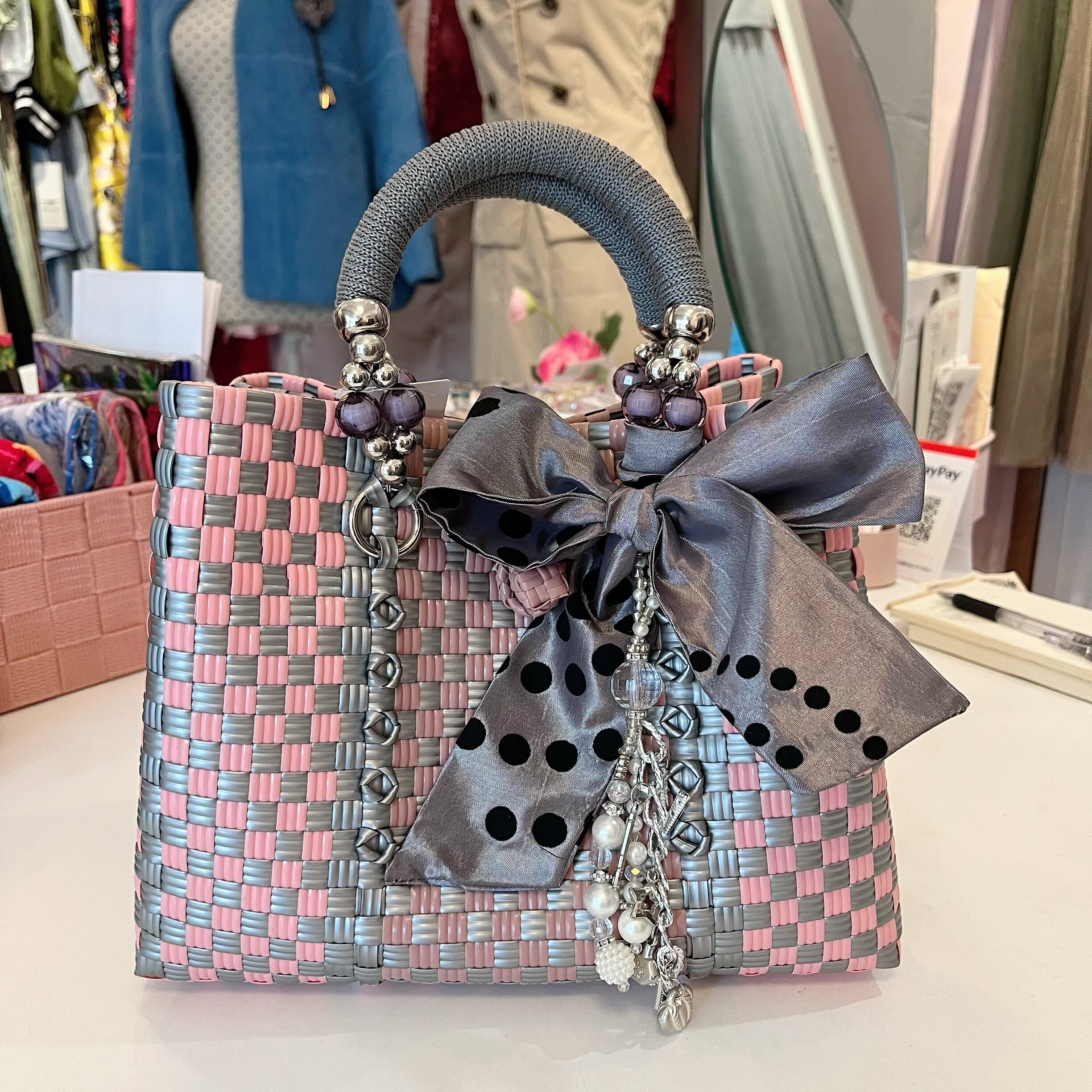 チャーム.リボンは取り外し可能なので、お手持ちのバッグチャームやスカーフでアレンジもできますね^ ^