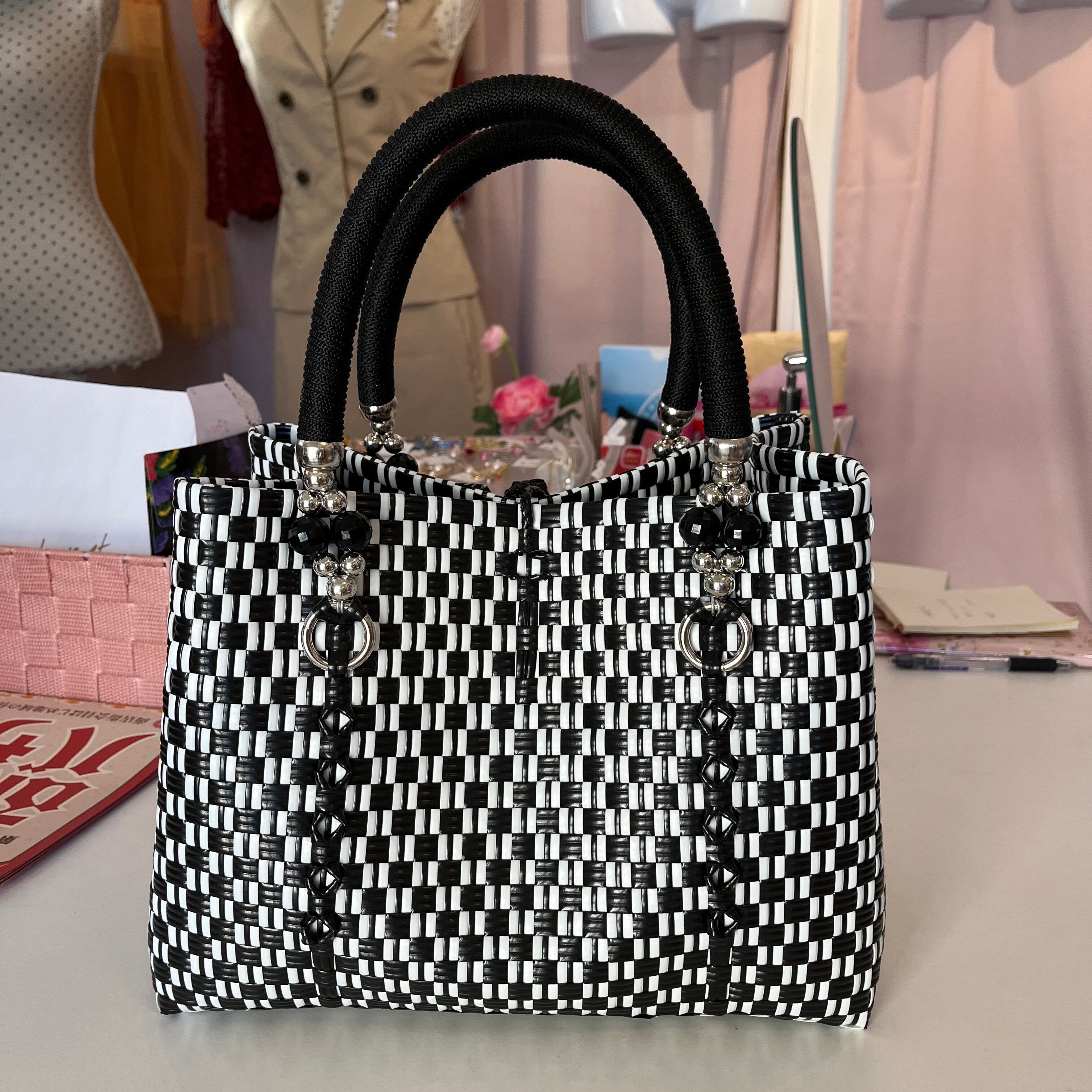 バリニーズバッグ.ロングショルダー.ブラック×ホワイト