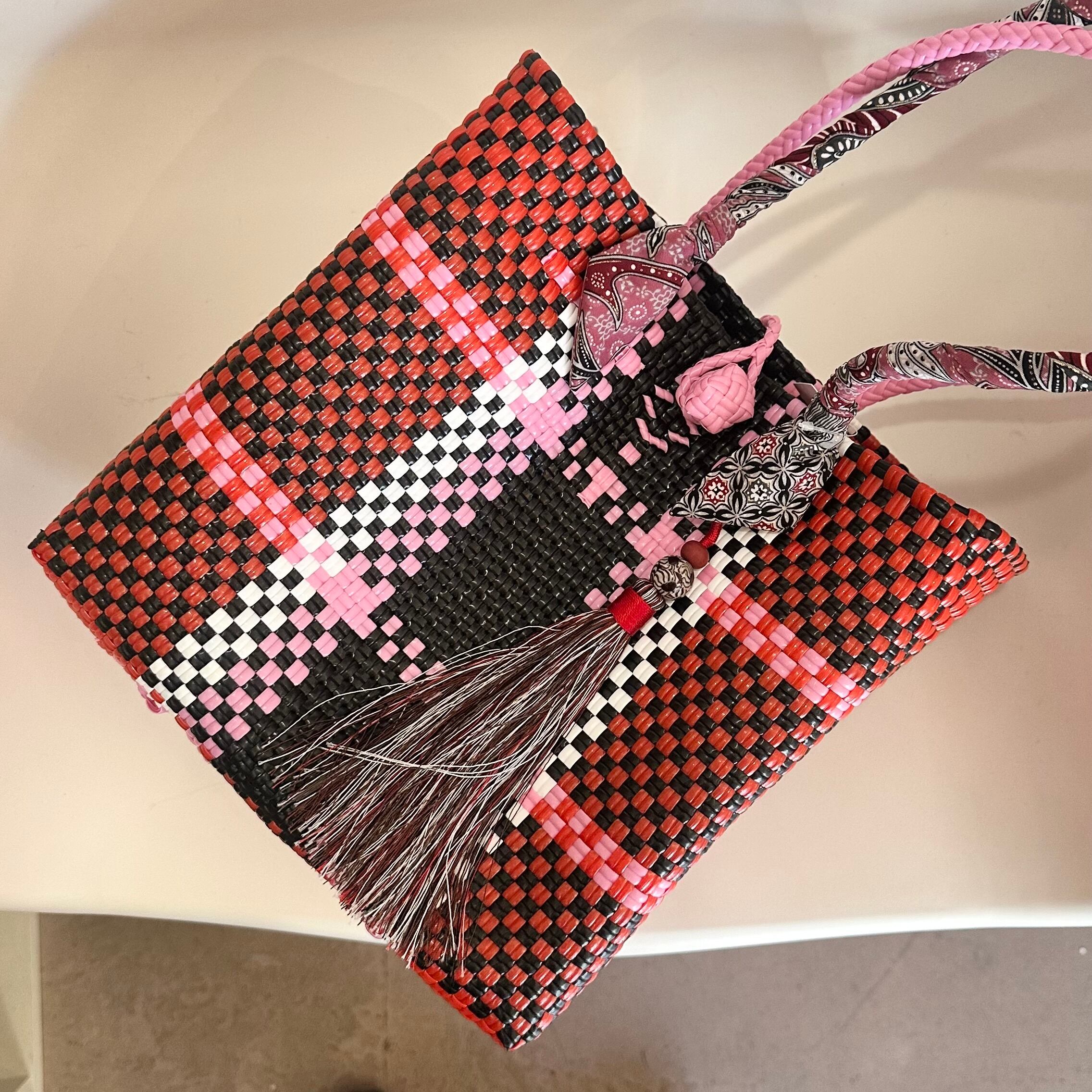 バリニーズバッグの中でも特に個性的なデザインを纏ったMサイズ、赤系マルチカラーです。