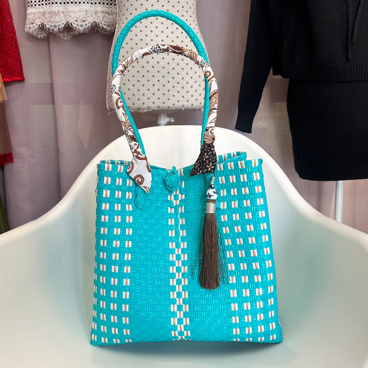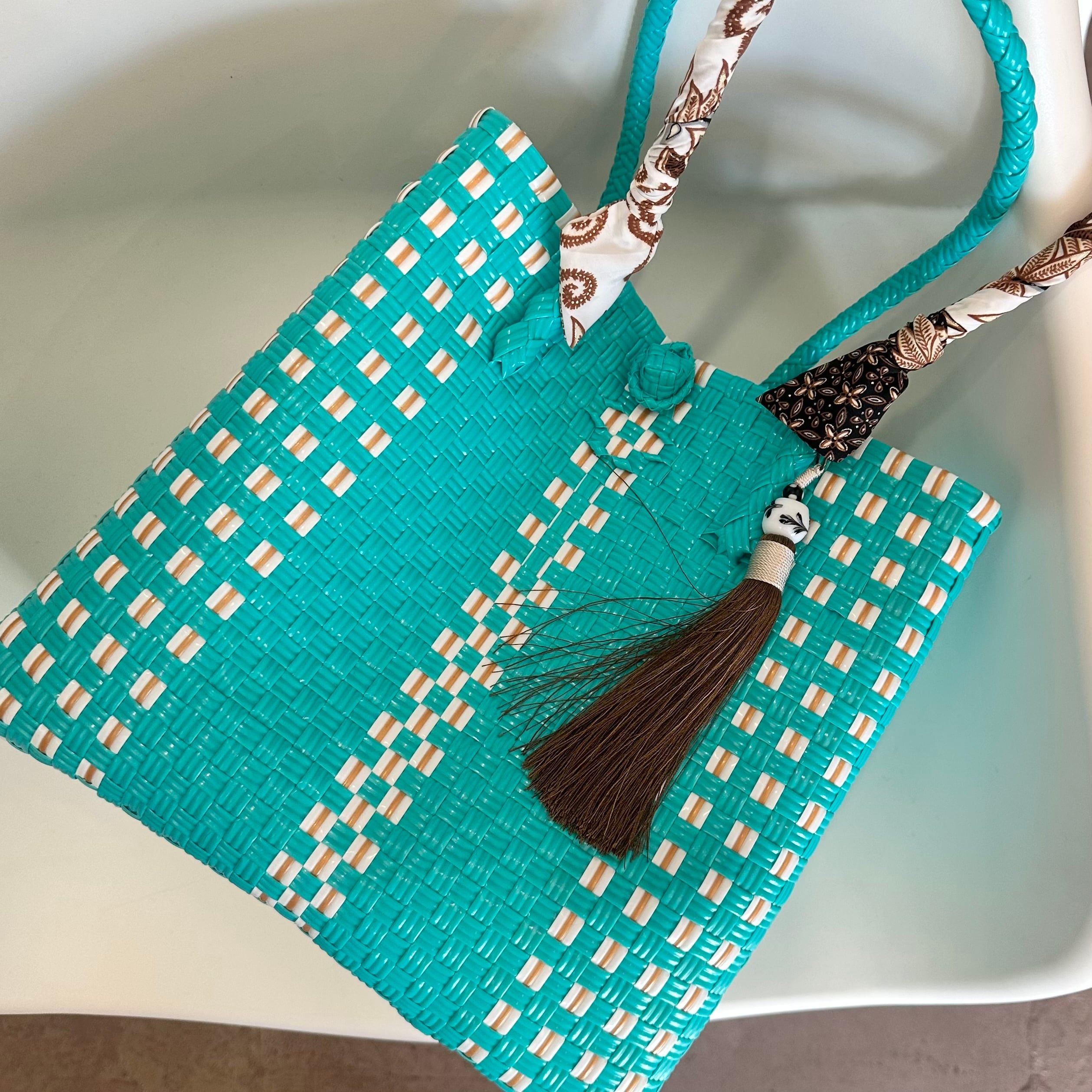 バリニーズバッグの中でも特に鮮やかな色合いが魅力のMサイズ、ターコイズ×ホワイト×ゴールドです。