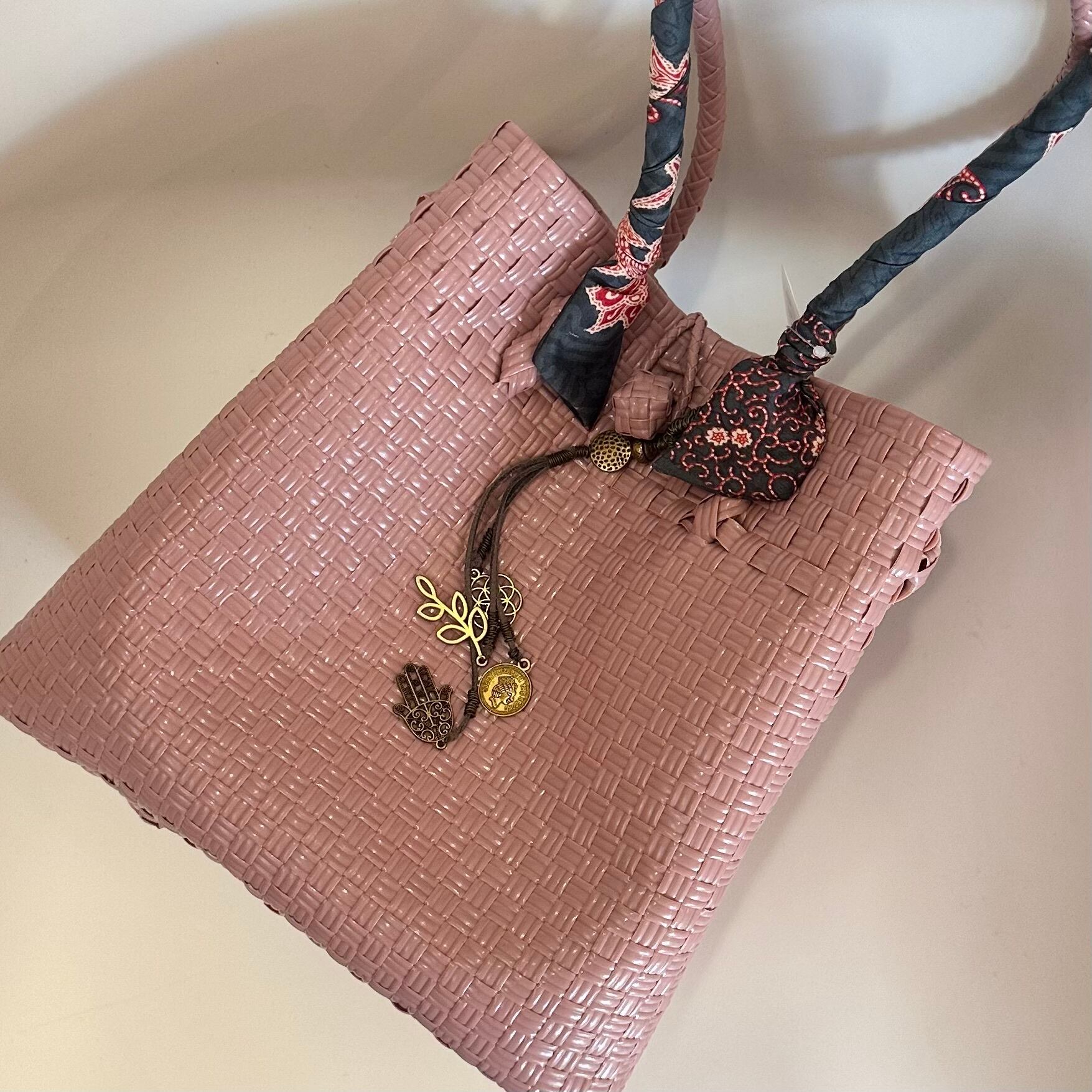 バリニーズバッグの中でも特に柔らかく優雅な色合いが魅力のMサイズ、グレイッシュピンクです。