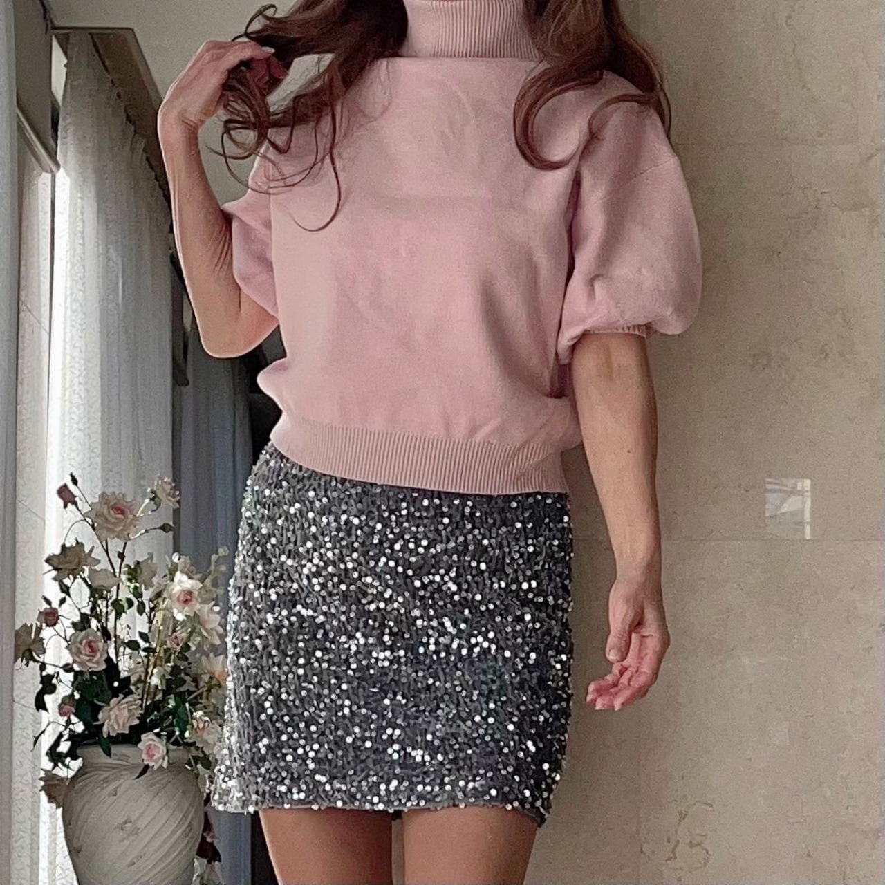 バルーンスリーブが特徴的なタートルネックニットトップスで、トレンドを感じるデザインが魅力です。